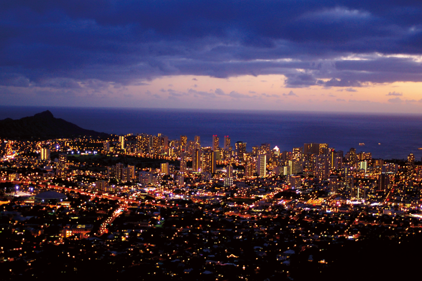 輝く夜景と海のパノラマを臨む極上ダイニング。メインは新鮮なアヒの刺身と骨付きショートリブ。