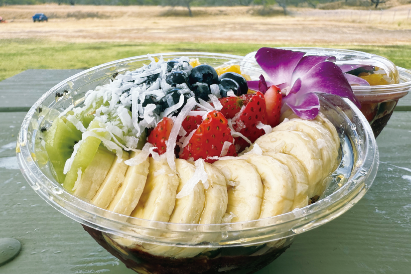 下山後の駐車場で、フルーツアサイボウルとマラサダ