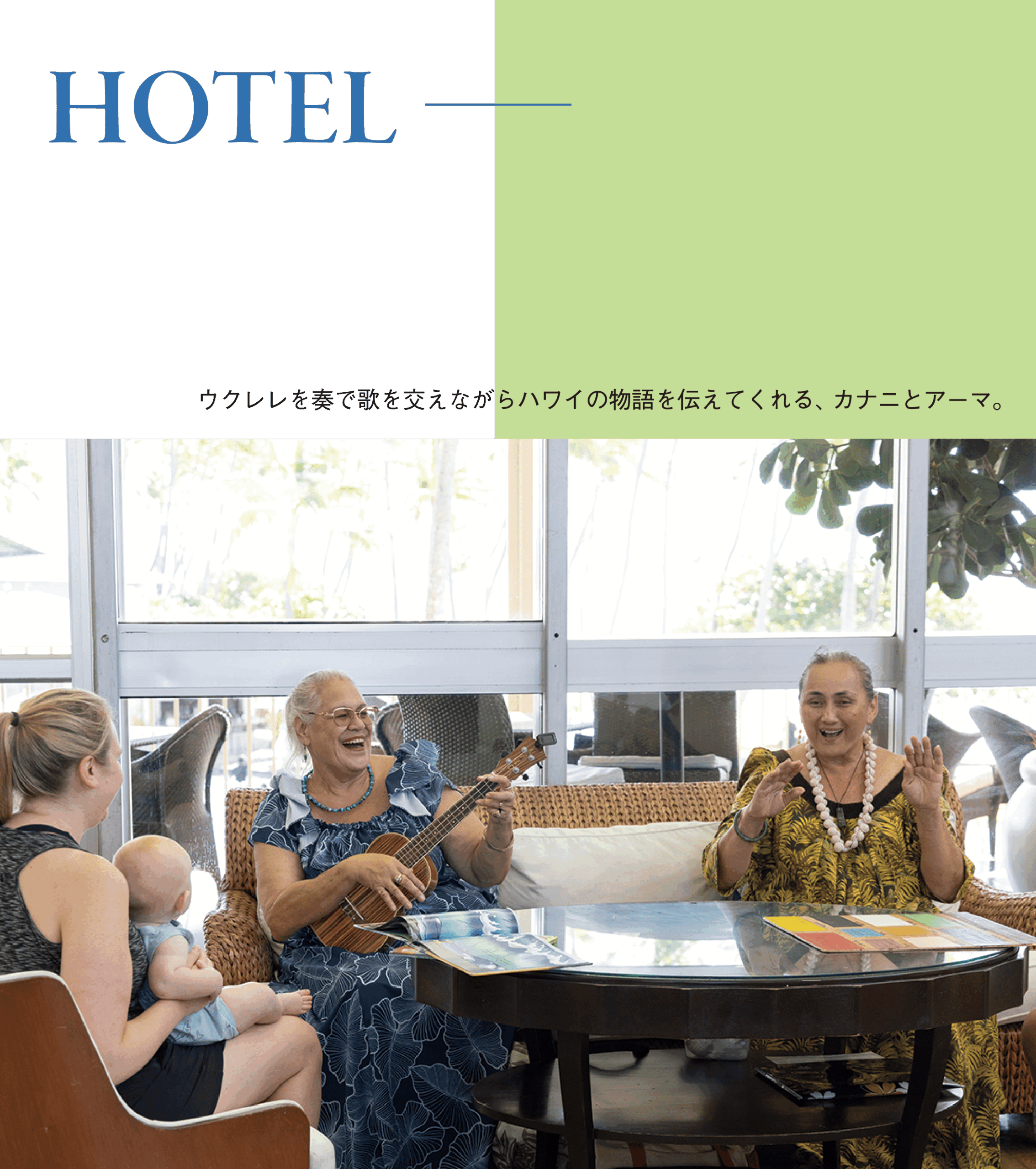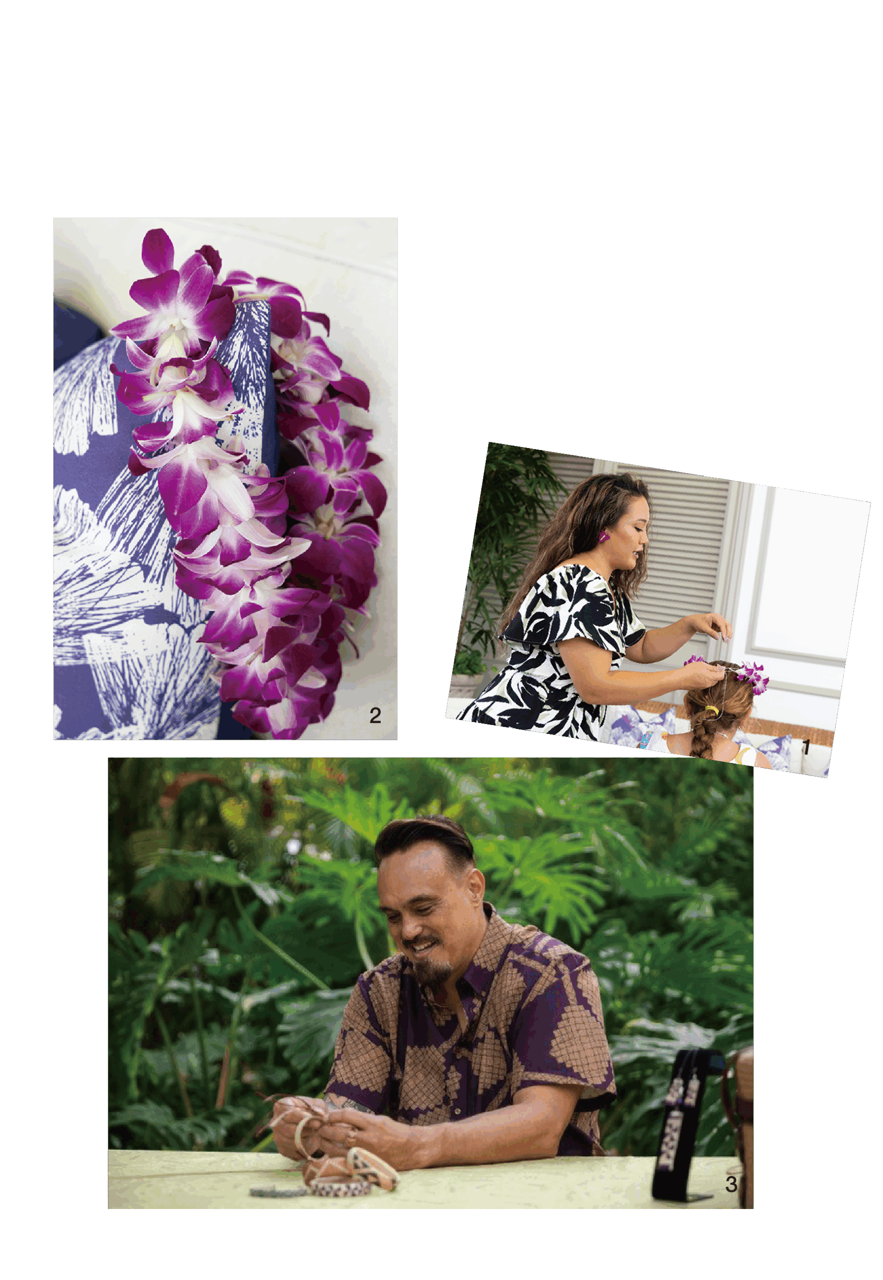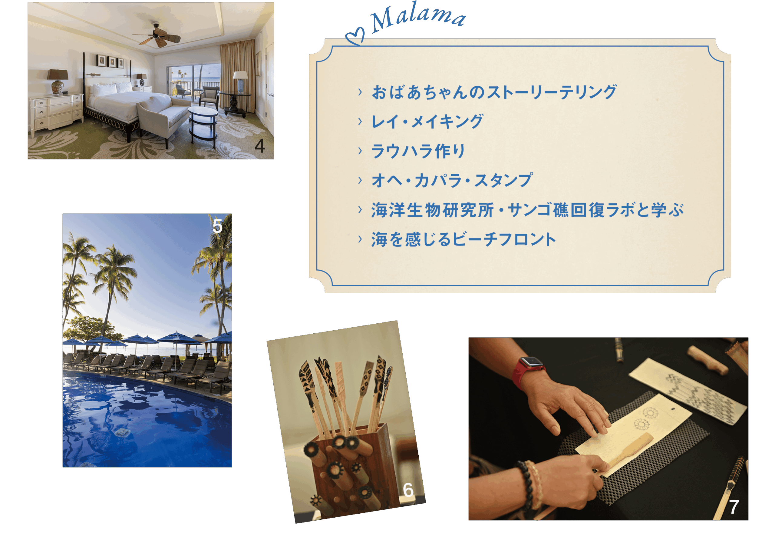 1.金曜と日曜は、レイまたは花冠のレイポオをレクチャーしてくれる。2.簡単な手順なので、子どもでも参加できる。3.ハラの葉を細かく割いてラグやバスケットを編む、ハワイ伝統のラウハラ編みを体験できるクラス。4.ビーチフロントの客室。イルカが泳ぐ、ホテル中央の池に面した部屋も人気。5.潮風が心地いいプールも魅力のホテルでは、静かでリュクスな時間が流れる。6.竹を彫って作られた伝統柄のスタンプ「オヘ」。ハワイに古代から伝わる伝統工芸「カパ」という木の皮を叩いて薄く伸ばした布に植物染料で独自の模様がつけられる。衣服や装飾品などに使用されていた。7.ホテルのプログラムでは、オヘを使ったオリジナルのしおり制作ができる。
