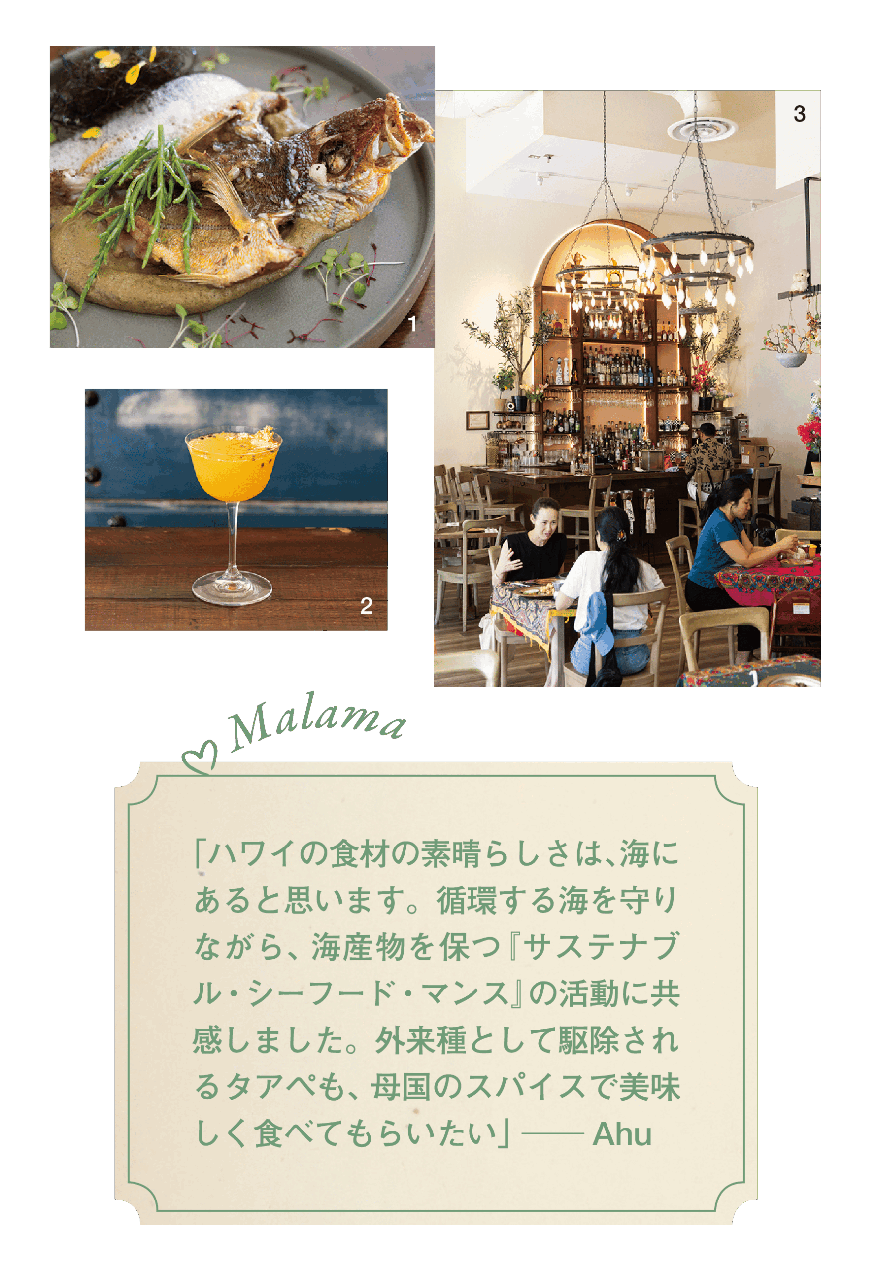 1.外来種として増え過ぎてしまったタアペと呼ばれる鯛の一種。海藻、オゴを添えた。コンサベーション・インターナショナル・ハワイと、非営利団体のシェフ・フイによる活動「サステイナブル・シーフード・マンス」を盛り上げる。Wholefishdish$36 2.カウアイ島産のリリコイとデーツを使ったカクテルGoldenDrift$14 3.異国情緒あふれる店内。