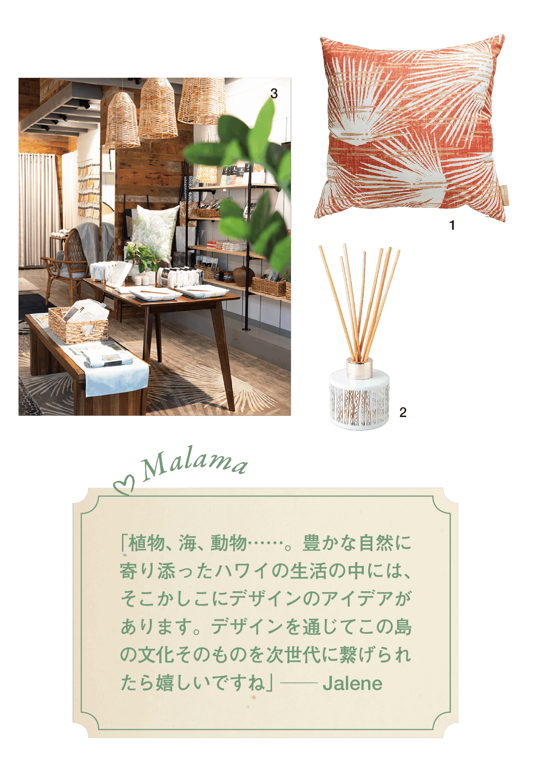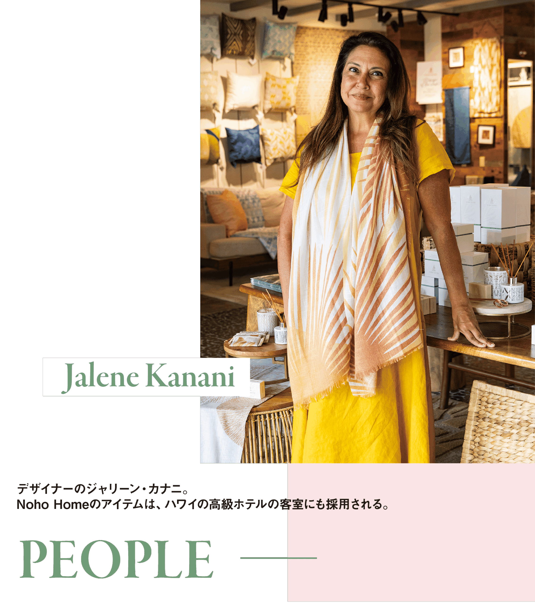 ハワイの自然からインスピレーションを得た、モダンなテキスタイルデザインやホームグッズが人気を集めている。Jaleneは、同じくデザイナーだった母の背中を見て独学でデザインを習得。ワイパフ地区に小さな工房を構え、デザインの落とし込みからプリント、縫製、仕上げまですべての工程を自社で行う。