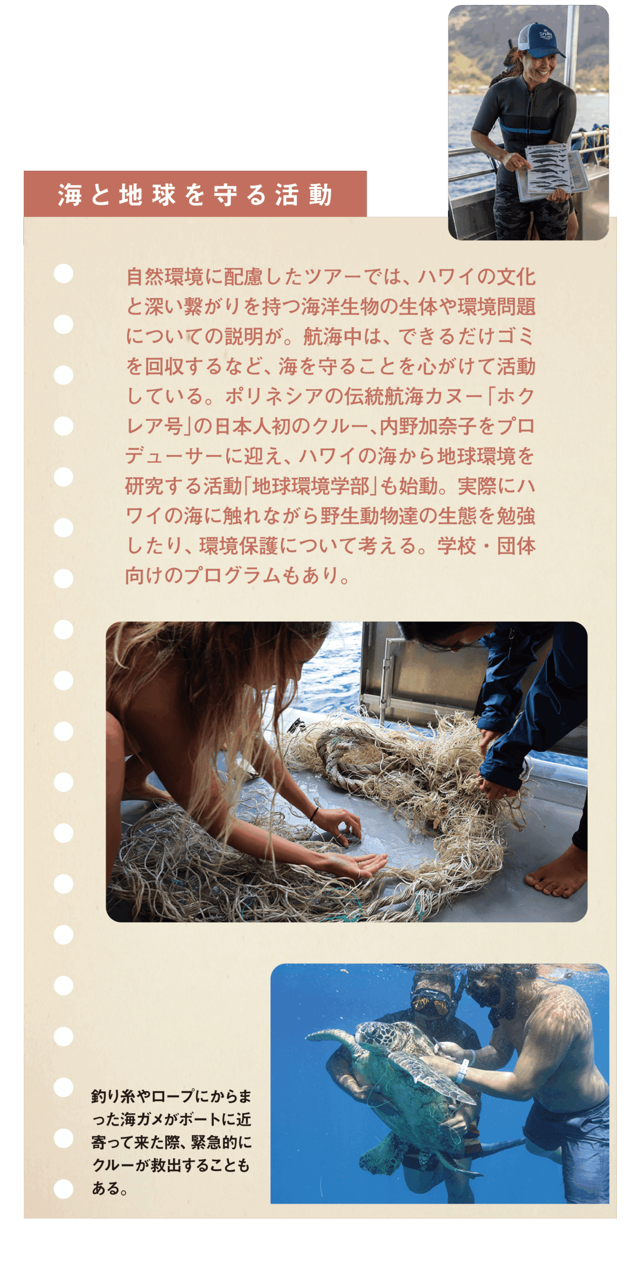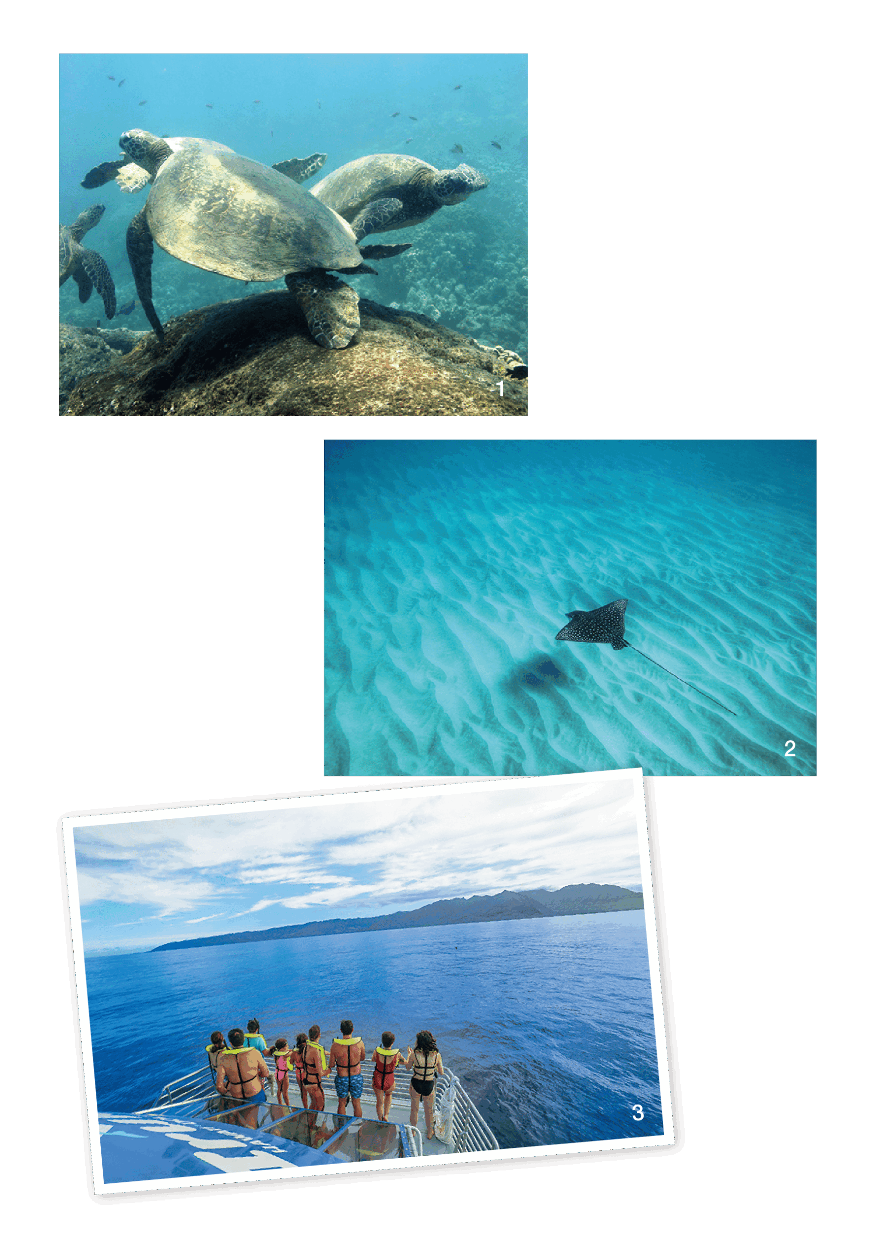1.澄んだ海の中、優雅に泳ぐウミガメ。陸でも海中でも3メートル以上離れることがハワイのルール。2.熱帯魚の群れや海底を悠々と泳ぐエイにも出合えることも。3.「イルカ大学」では、揺れの少ない双そうどうせん胴船、カタマランで沖を目指す。風を切って大海原を進む船上のワクワクも醍醐味だ。