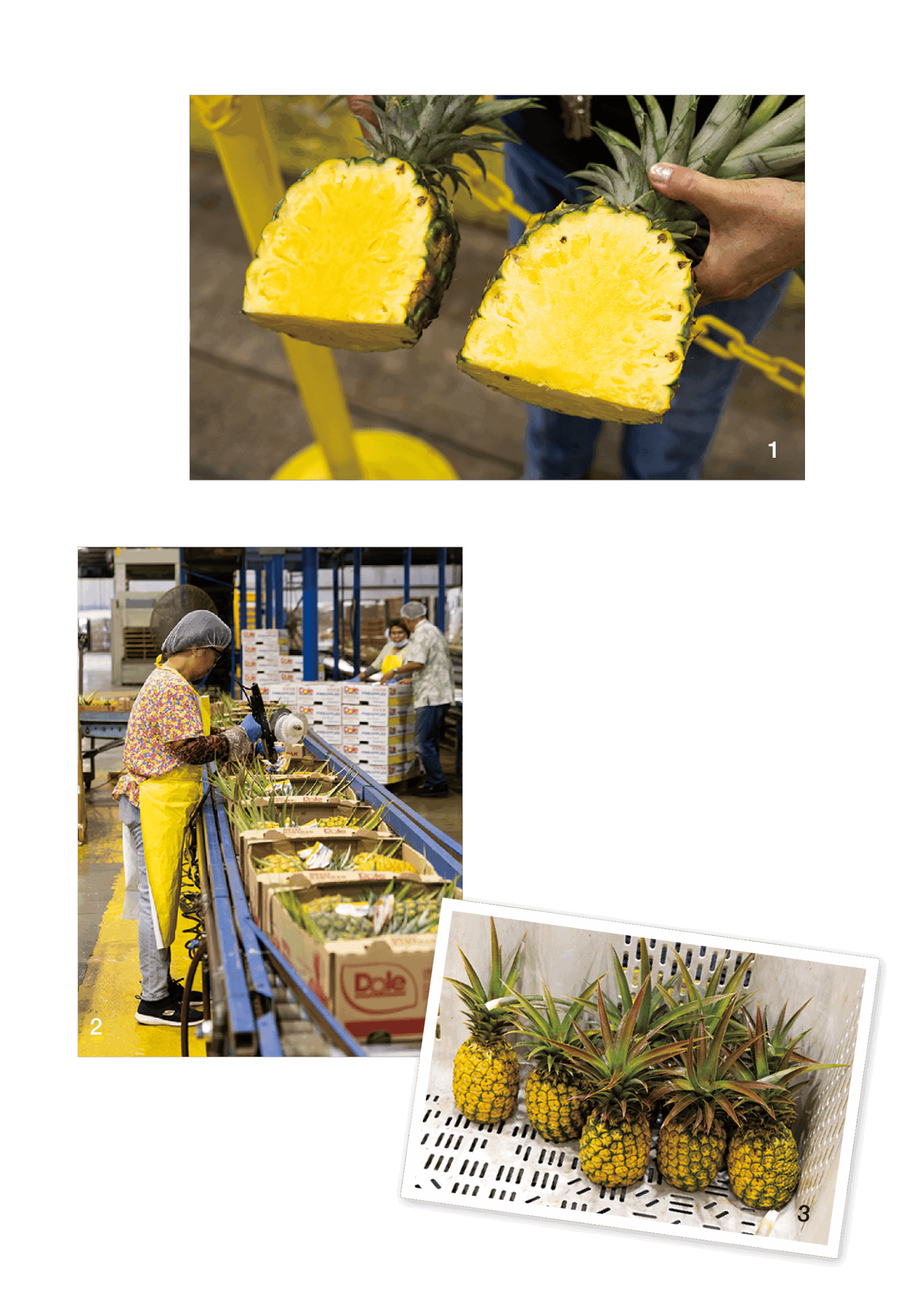 1.収穫したばかりのパイナップル。熟し過ぎているものはジュースになる。2.箱詰めも手作業で行われている。3.95%はハワイ州内で消費されるため、滞在中にぜひ味わって。