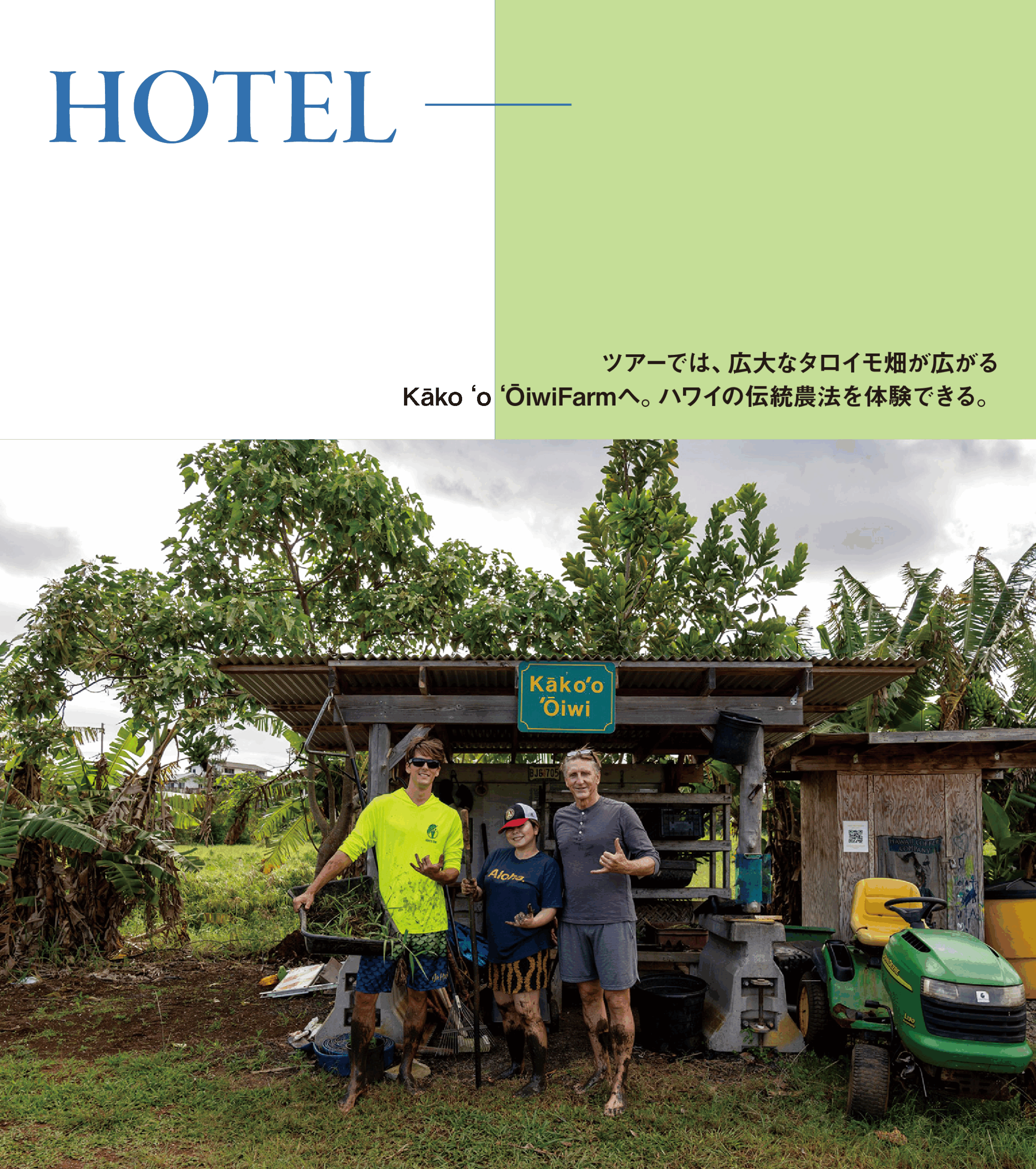 懐かしさを感じるデザインで統一された館内は、やわらかな島の気配に満ちている。風の通るロビーやダイニング、プールサイドには南国の植物が青々と茂り、カフェではマウイ産のスペシャリティコーヒーが香る。ホテル主催のツアーでは、自然に寄り添う持続可能な農業を実践する「Kāko‘o‘ŌiwiFarm」での体験が人気。支配人とともにダイニングで地産食材の朝食を味わうところから始まるツアーは、土地の豊かさに気づかせてくれる特別な時間だ。