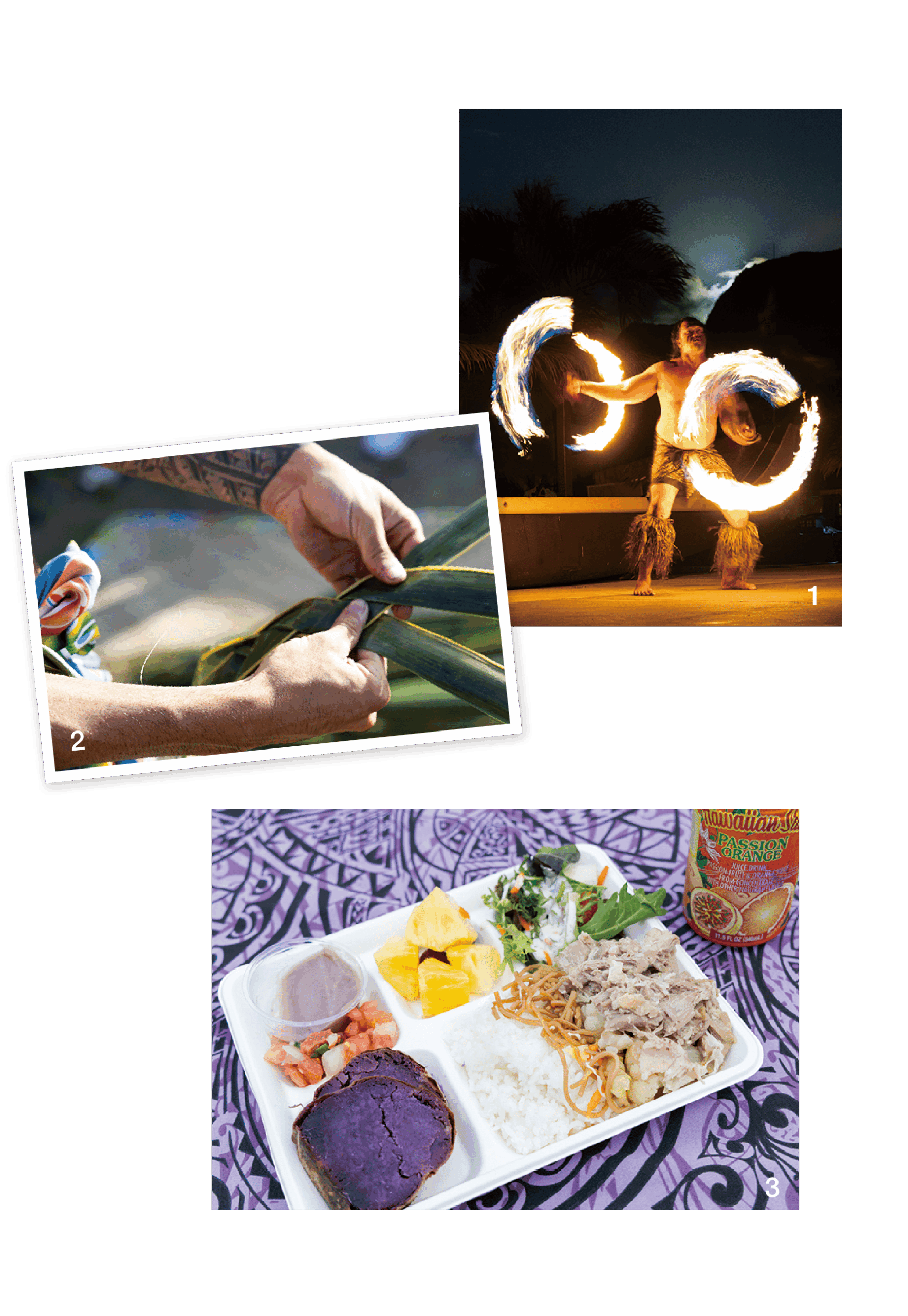 1.海を渡ってきたポリネシア文化との深い繋がりを感じさせてくれる、ファイヤーダンス。2.会場では、ココナッツハットやレイ作りなどのワークショップも。3.カルアポークやポイ、ロミサーモン、蒸した紫芋など、ビュッフェ形式の食事にはハワイの伝統食が数多く並んでいる。