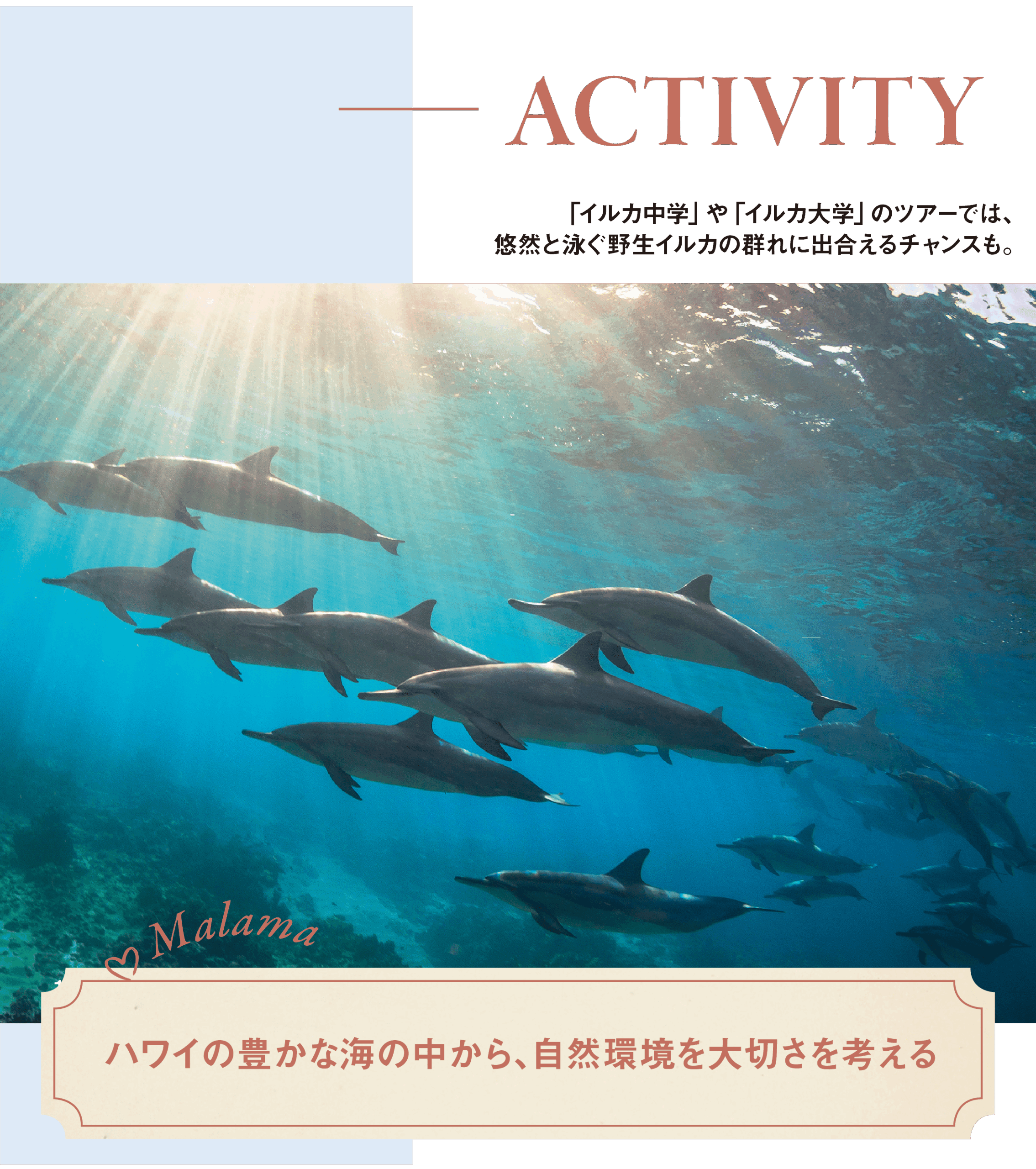 IrukaHawaiiが運営する4つのツアーでは、内容の異なるシュノーケルが体験できる。スピードボートで高確率でイルカに会える「イルカ中学」、展望席付きカタマラン船でマリンアクティビティーも体験できる「イルカ大学」、ウミガメや熱帯魚との感動的な時間を味わえる「ワイキキカメ大学」。さらに、ハワイ島コナコーストのサンセットを眺めながら夜の海へ、大迫力のマンタを探しに行く「マンタ大学」。どのツアーも、海や海洋生物を通して学びを得ることができる。