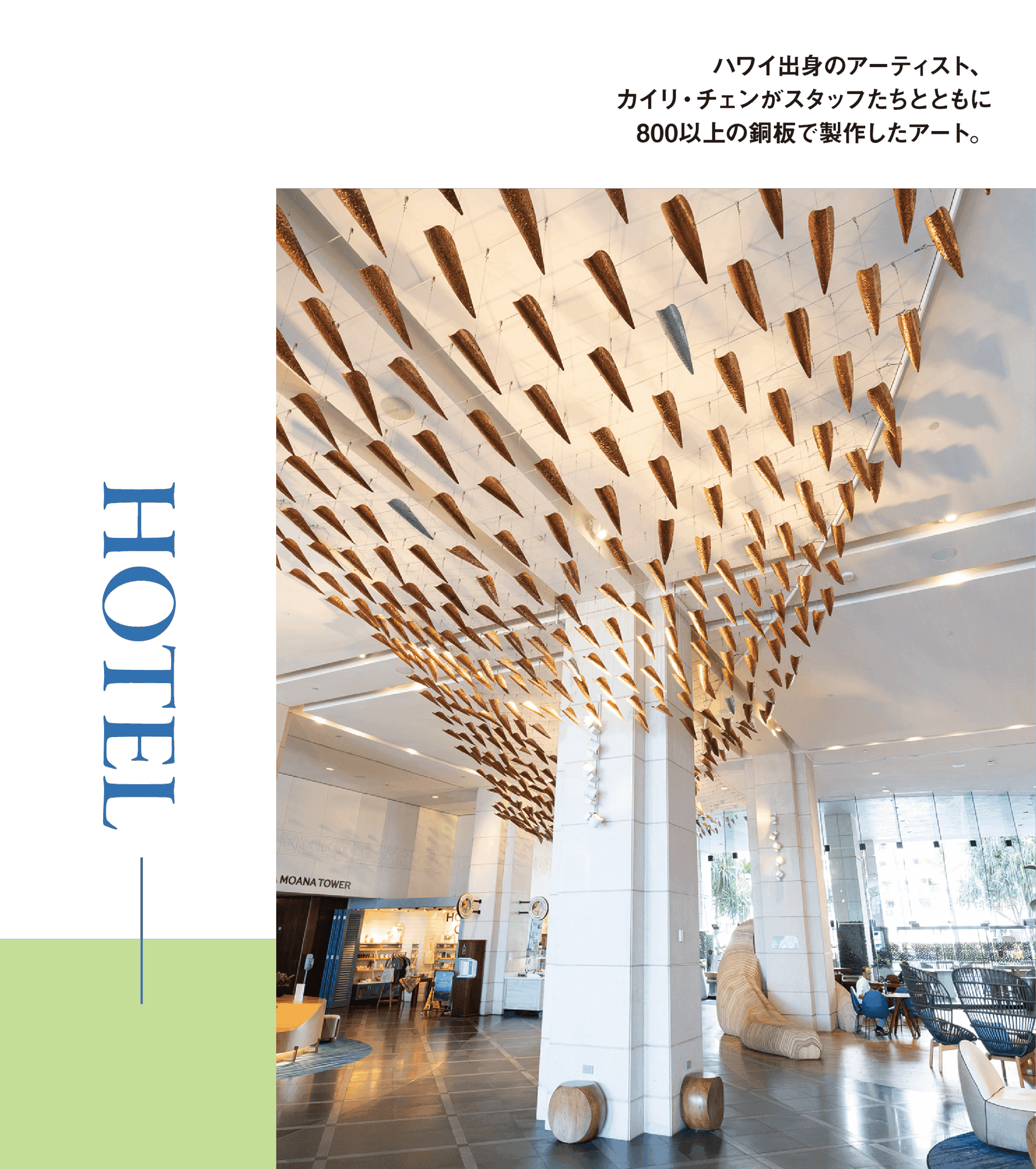 ヒナナフィッシュを模ったアートがロビー天井を彩り訪れる人を迎える。客室にはナイオの花や海藻リムエレエレのペイントが施され、ヨットハーバーを望むホテルはマラマハワイの精神にあふれている。宿泊ごとに1ドルが博物館や環境保護団体に寄付され、ゲストもその輪に参加することが可能だ。レストランでは地元の食材を使った料理を提供し、フードロス削減にも貢献。クリスマスにはクラフトマーケットも開催し、地域とゲストをやさしくつなぐ。