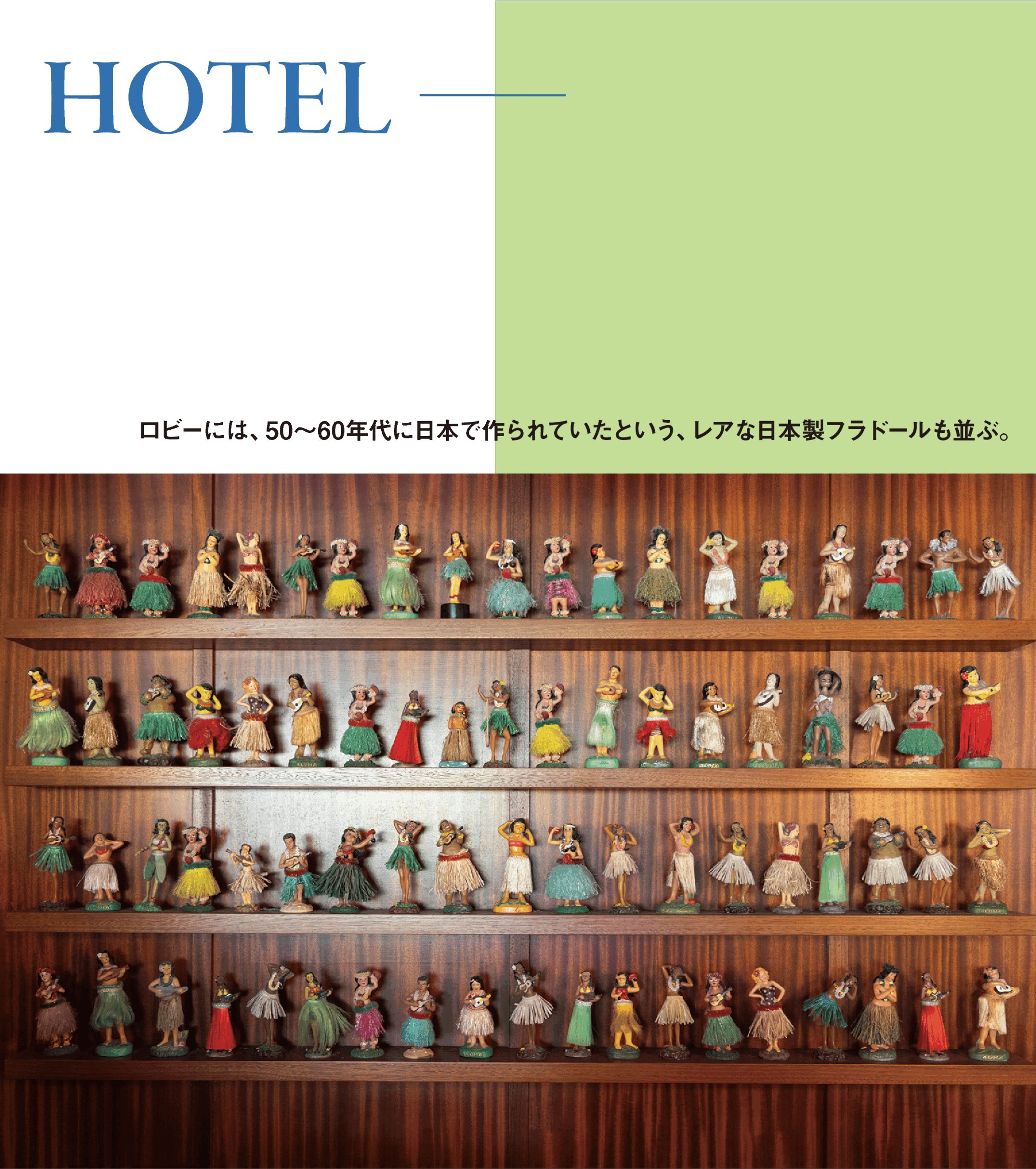 モンステラの壁紙やラウハラのバスケット、ずらりと並ぶレトロなフラドール。壁を彩るモノクロ写真の中には、ビショップ博物館から借り受けた貴重な一枚も。1960年台のハワイをモダンにアレンジしたロビーでは、時折ウクレレの心地よい音色が響き渡る。ホテルのミッションは、ハワイの文化を伝えること。この島の植物を使ったカクテルや、多国籍のエッセンスを取り入れた食事も堪能でき、文化と食、空間すべてに“本物のハワイらしさ”が宿る。