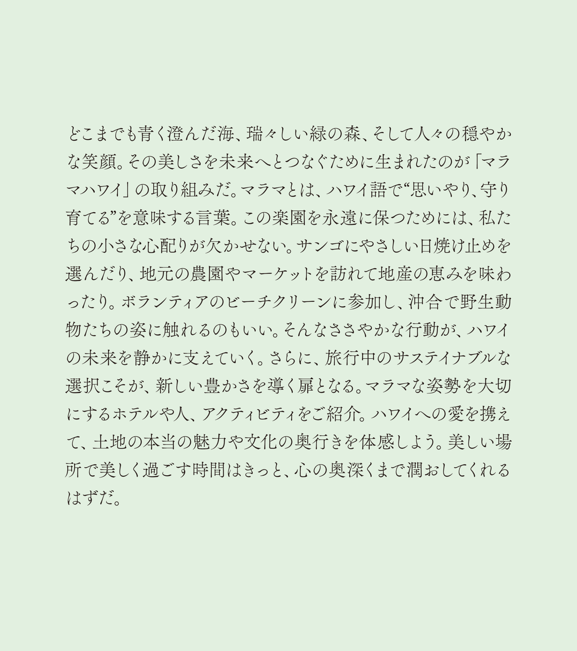 静寂さが魅力の、歴史ある海辺のリゾートではマラマハワイに直結する多彩なプログラムが用意されている。ハワイの文化を未来へ受け継ぐ独自の活動「KISCA(キスカ)」は、神話や昔話、自然の尊さを語るストーリーテリングや、レイやラウハラといった伝統工芸体験、さらに海洋研究所との学習体験や地域の自然保護活動まで広がる。プログラムは毎日開催され、宿泊客でなくとも参加が可能。旅の中でハワイの自然や文化を深く感じる特別な時間だ。
