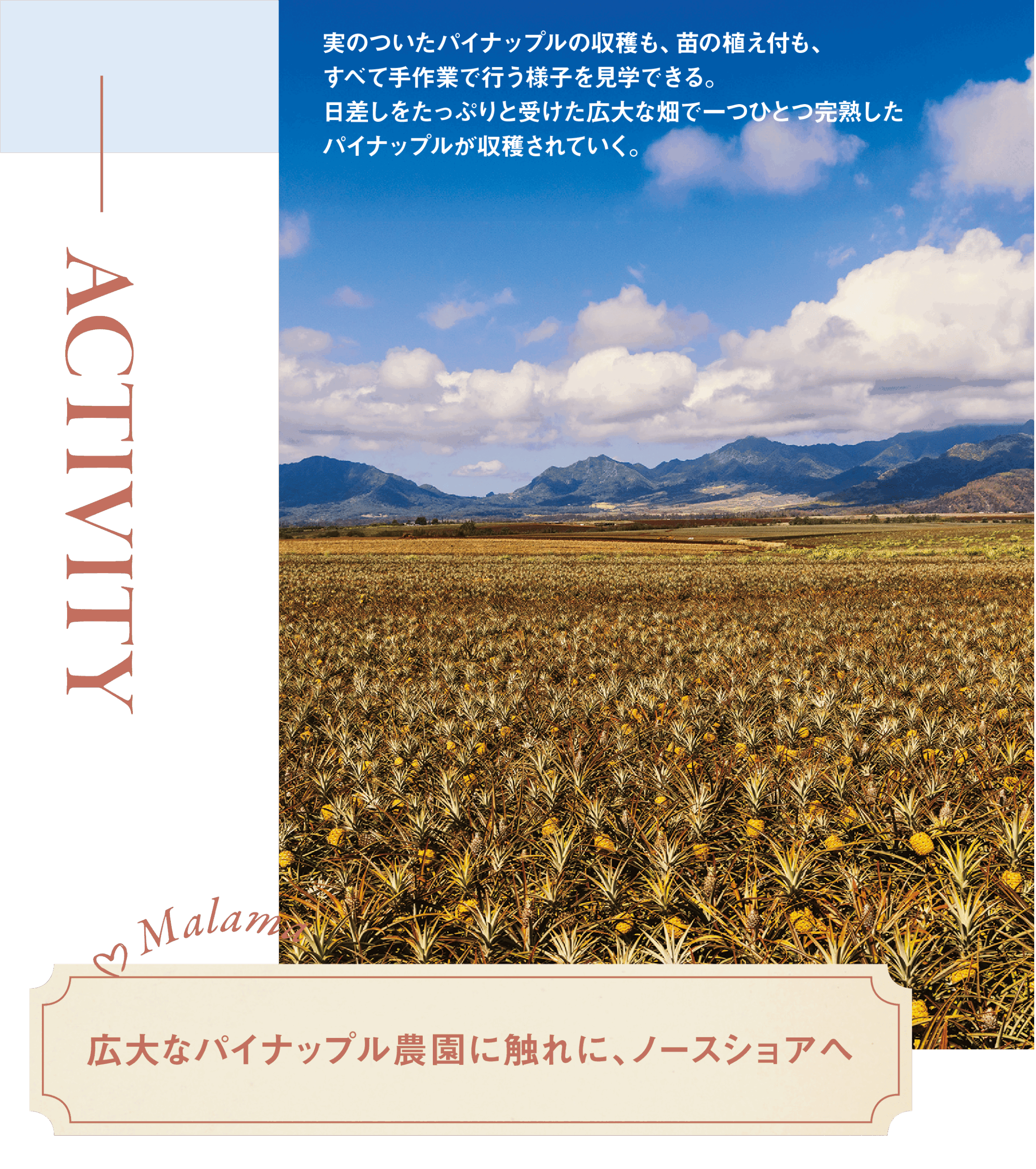 ノールショアまでの道すがら、ワイアナエ山脈を背景にした赤土の広大なパイナップル畑が広がっている。創業1900年代初頭という歴史あるドールの畑では、収穫から洗浄、仕分け、箱詰め、ラベル付けまですべて手作業で行われる様子を間近で見学できる。毎日手摘みによって収穫されるパイナップルの数は、1日5万個を超える。ノースショア観光では、ゲストのリクエストに応じてランチやショッピングへ。