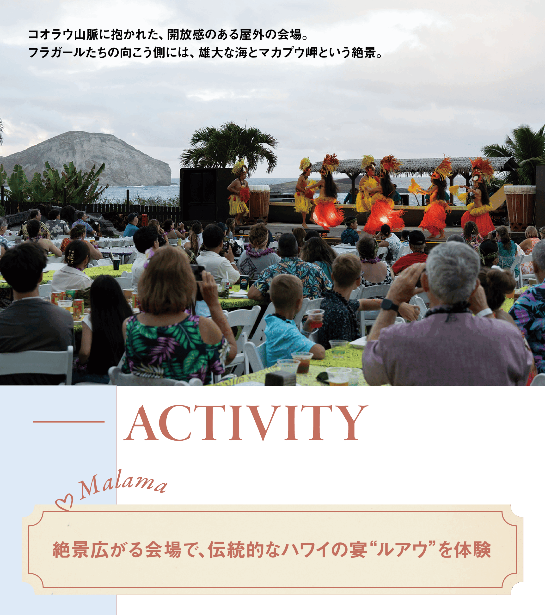 オアフ島の東端にある「シーライフパーク」では、ハワイの伝統を受け継ぐ宴、ルアウの体験を。夕暮れ時、コオラウ山脈を背景に広がる会場に、ハワイアンミュージックが流れはじめる。舞台に立つダンサーの力強くもしなやかな動きは、目を奪われるほどの美しさだ。テーブルには伝統料理が並び、ひと口ごとに土地の記憶がよみがえる。神聖なる夜の宴は、古代ハワイ王朝時代を旅しているような感覚。