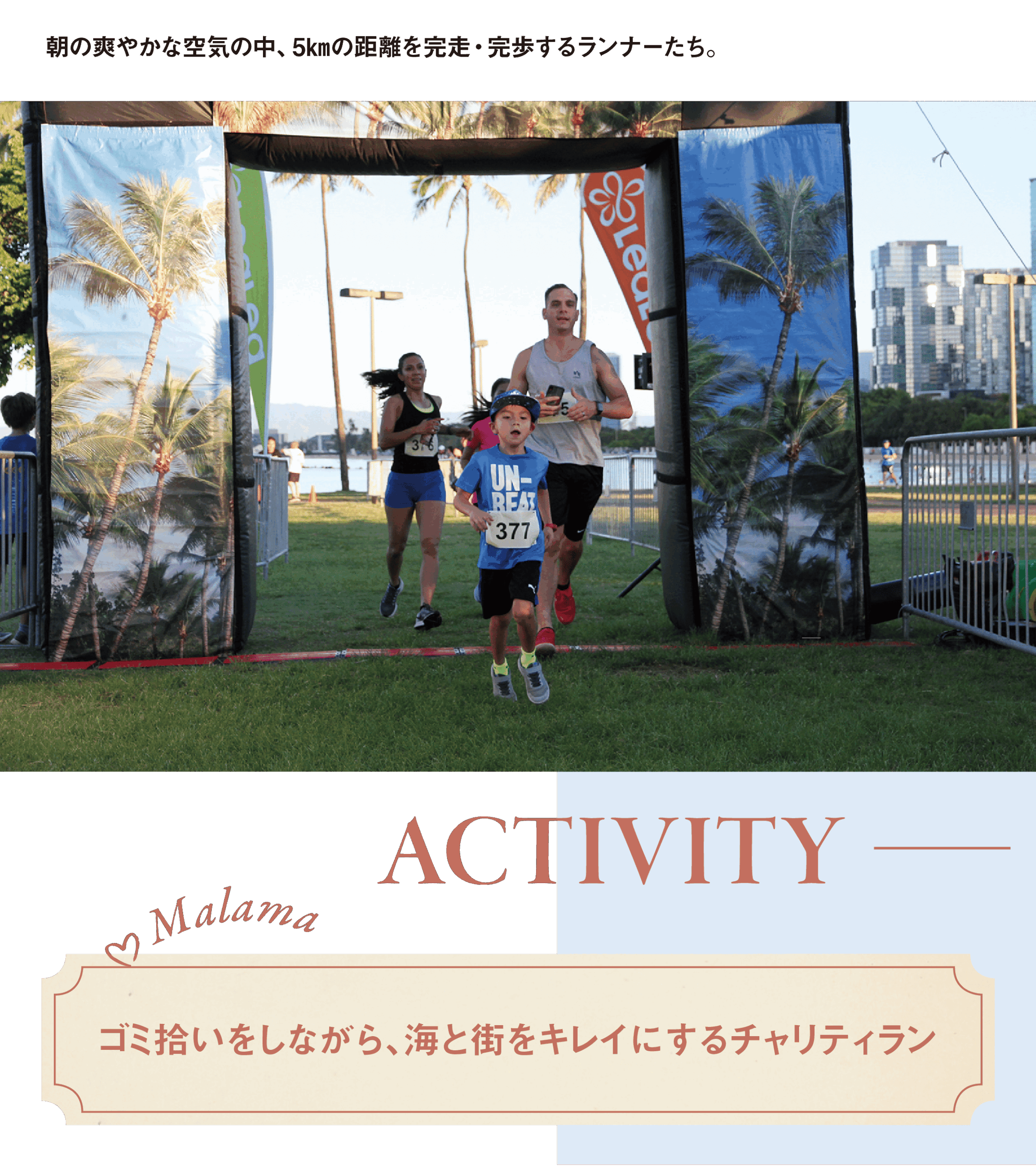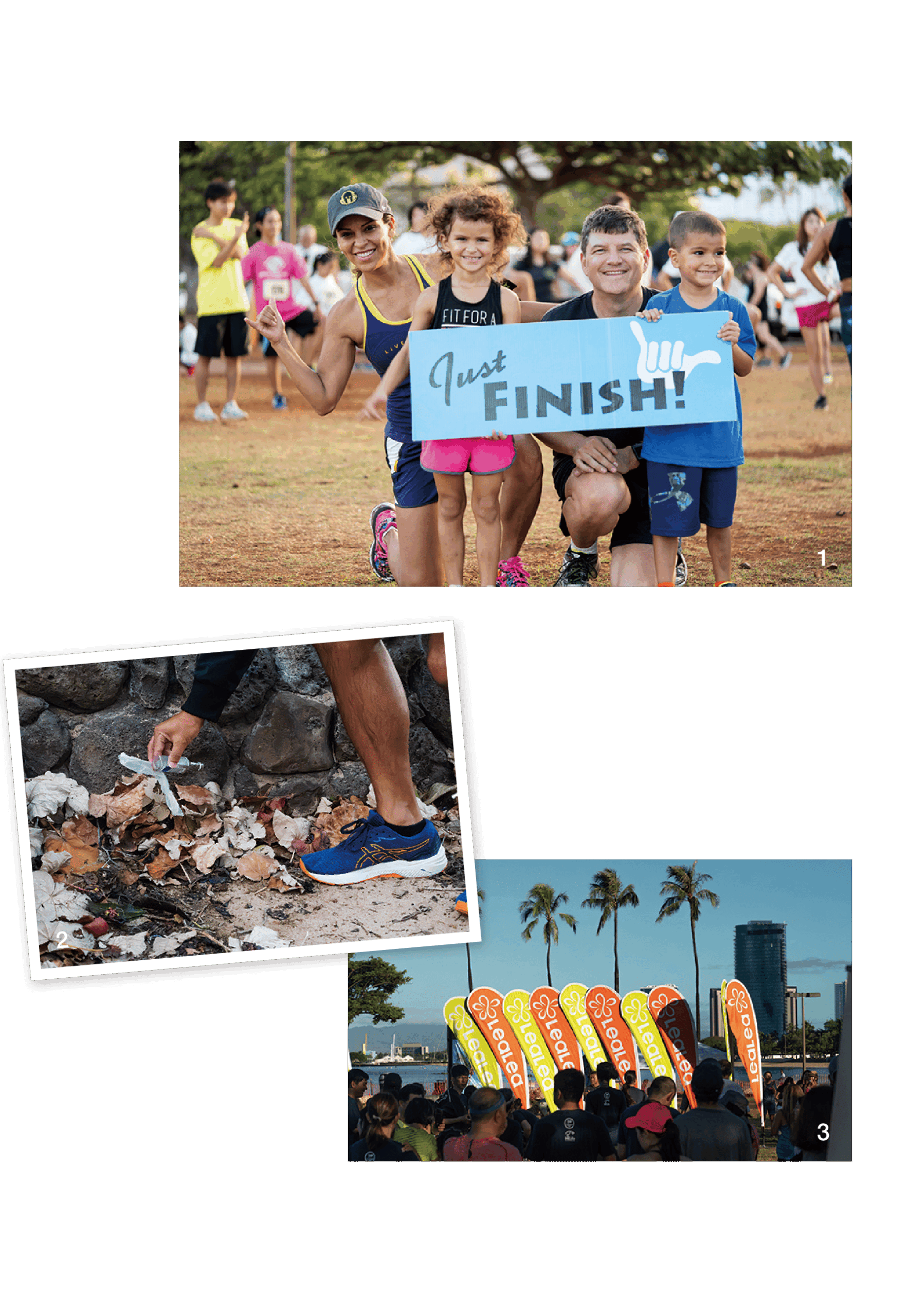 1.ハワイを思いやる心を育てられるチャリティイベント。ゴール後には、参加者が協力しビーチクリーンも行われる。2.専用のゴミ袋が配布され、走りながらコース上でゴミを拾う“プロギング”も。3.ハワイの地域社会を支援し、地元に根差した恒例のイベント。
