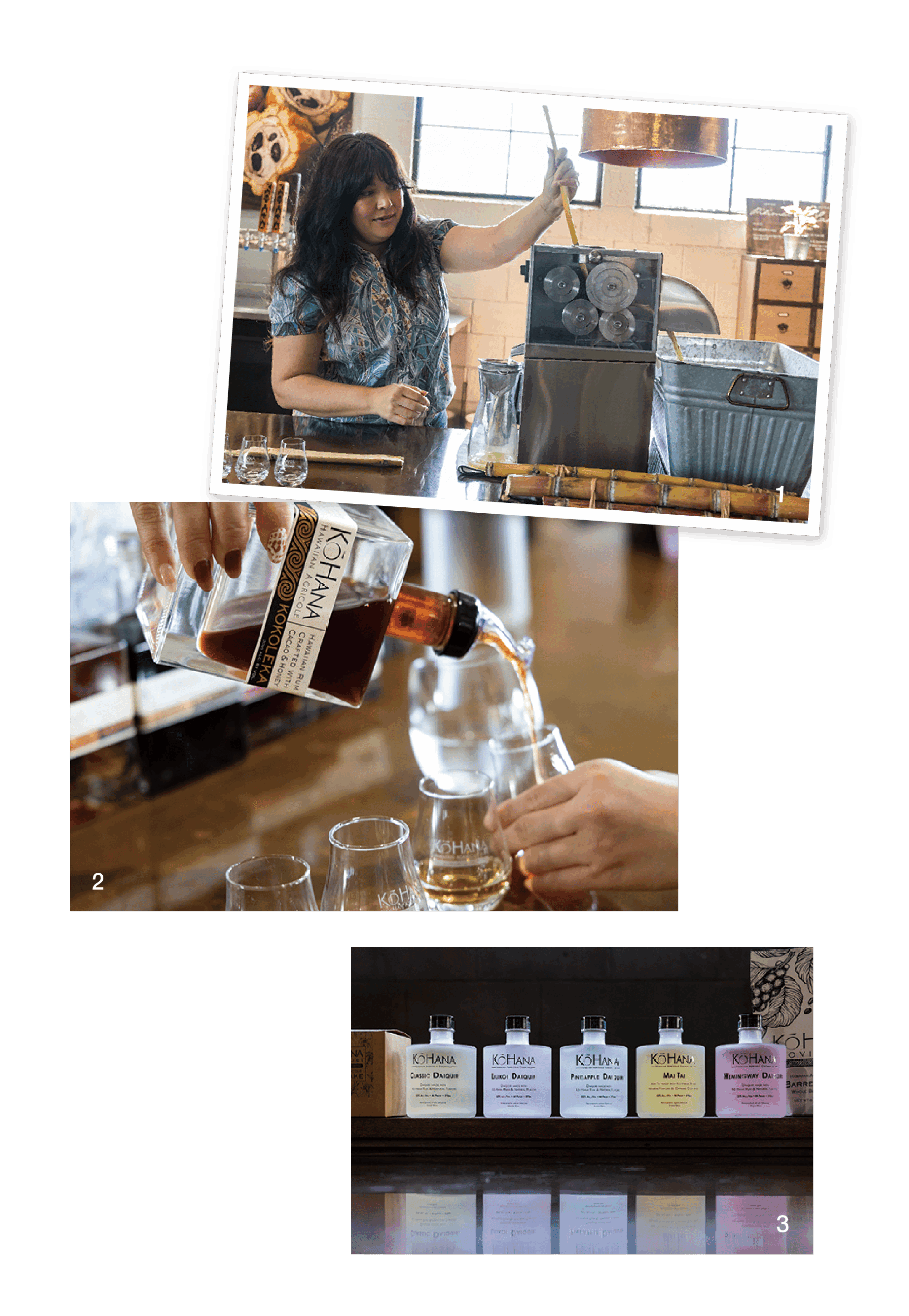 1.ラム酒作りにも使われる絞りたてのサトウキビを、そのまま試飲させてくれる。2.深い色に熟成した最高級のラム酒。ショップにはハワイ産のマノアチョコレートとのコラボ商品などもある。3.マイタイやパイナップル、リリコイなど、カラフルなカクテルフライトもお土産に人気。