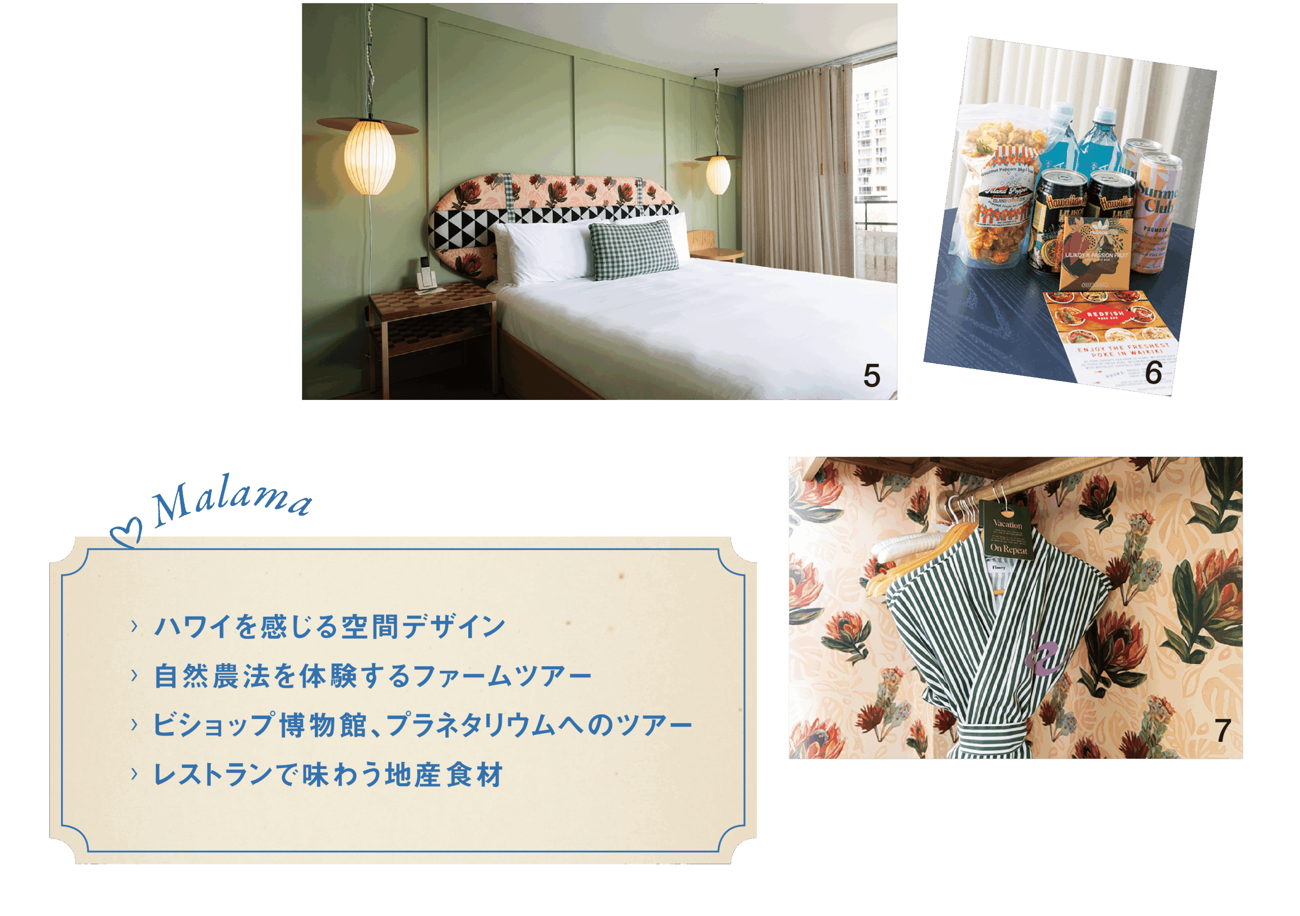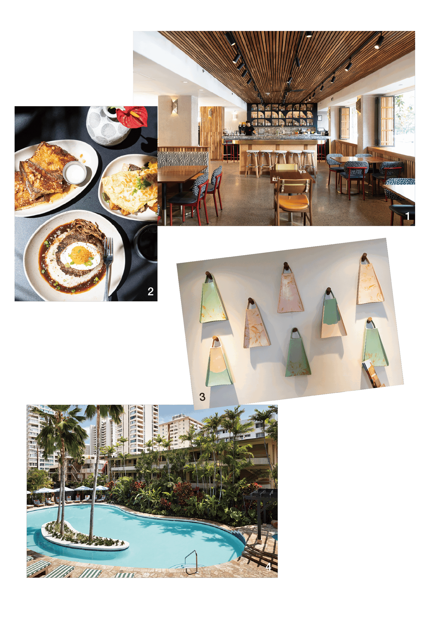 1.風が通り開放感のあるレストラン「RedFish」。2.ハワイ産ビーフのロコモコやアップルバナナのフレンチトーストなど、地産の食材を使った朝食。ホテルが主催するファームツアーやビショップ博物館ツアー、プラネタリウムツアーには、選べる朝食がセットになっている。3.フロントデスクの壁に飾られたフィンはアートのよう。館内のショップにも、ハワイを感じられるアイテムがたくさん並ぶ。4.南国の植物に包まれたプールエリアは、都会のオアシスのよう。5.レトロハワイをテーマにデザインされた客室、コーナーキングルーム。地元のインテリア会社がハワイらしさを表現。6.客室には、ハワイ産のお菓子や飲み物が用意されている。7.クローゼットには洒落たバスローブが。マグカップやキャップなどオリジナルグッズが購入できるのも嬉しい。