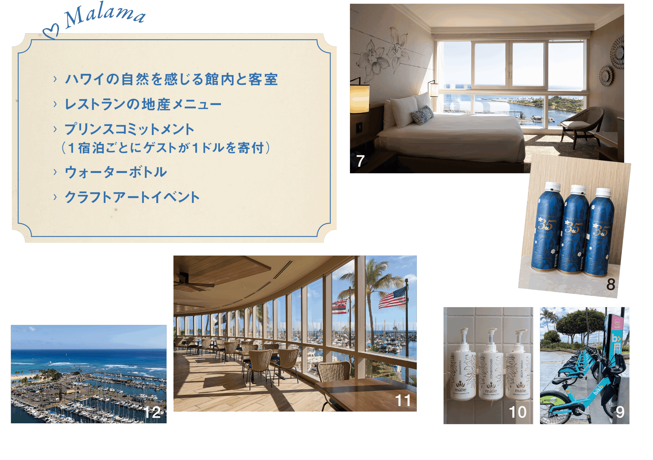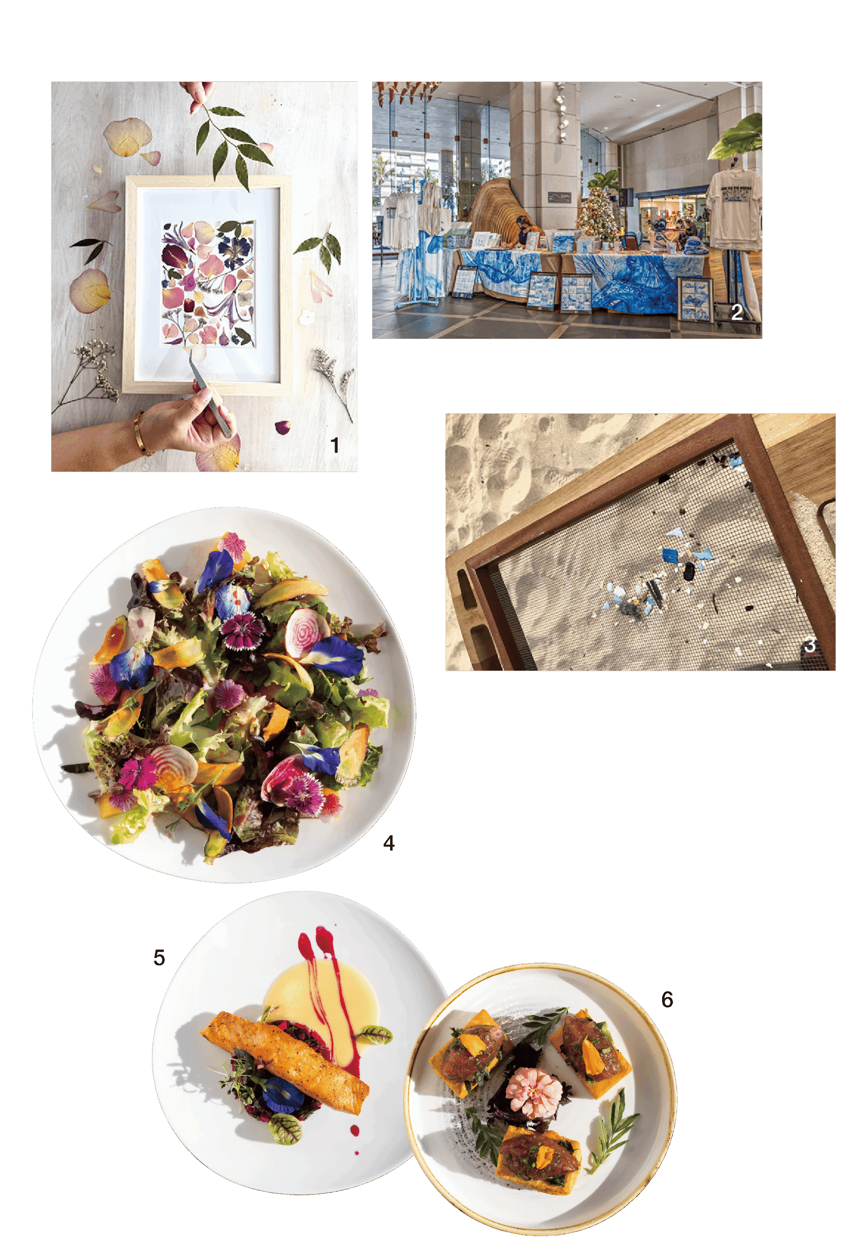 1.ロビーで行われるサスティナビリティやオーガニックを意識した押し花アートのワークショップ。2.ホリデーには地元の作家によるクラフトのショップも登場。3.サステイナブルコーストラインズハワイと協働する。4.地産の野菜やエディブルフラワーを盛り合わせたカラフルなサラダは、リリコイとハイビスカスの爽やかなドレッシングで。GardenVegetableMelangeSalad15ドル5.サーモンの付け合わせ野菜、ビーツとフェンネルのソースはハワイ産の食材を使用。BigGloryBaySalmon42ドル6.ハワイ産の新鮮なマグロのタルタルに、地産のネギを添えた一皿。AhiTartare18ドル7.全室オーシャンビューの客室。8.何度も使えるウォーターボトル。ウォーターサーバーもホテル内各所に。9.CO2削減、大気汚染を考慮し、レンタルサイクルや電動スクーターの利用を推進する。10.ハワイ発のオーガニックスキンケアブランドのMaileは、リフィル式で提供。11.サンセットが美しいレストラン「100セイルズ」。ディナービュッフェにも、地産食材のメニューが並びファンも多い。12.ホテルからの絶景。