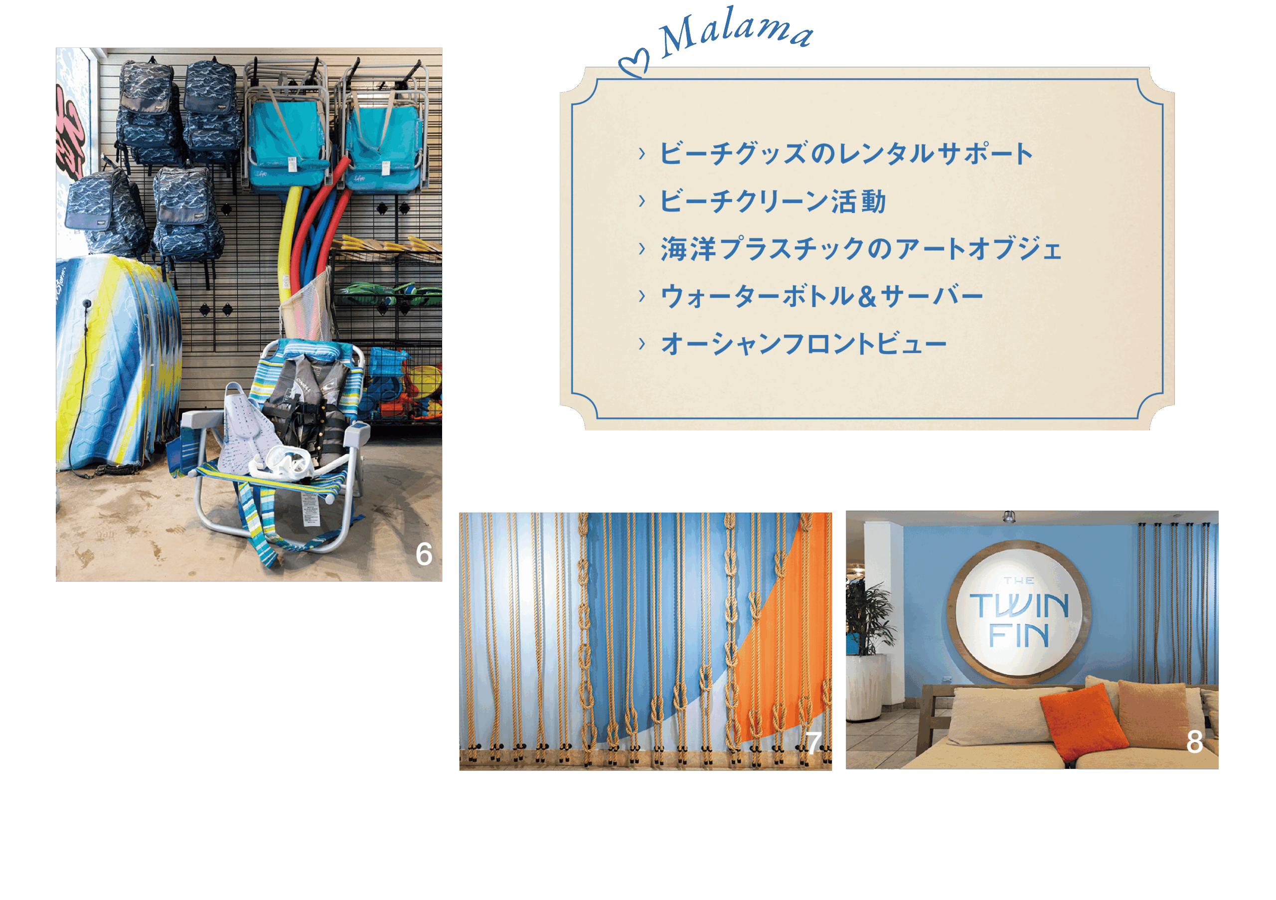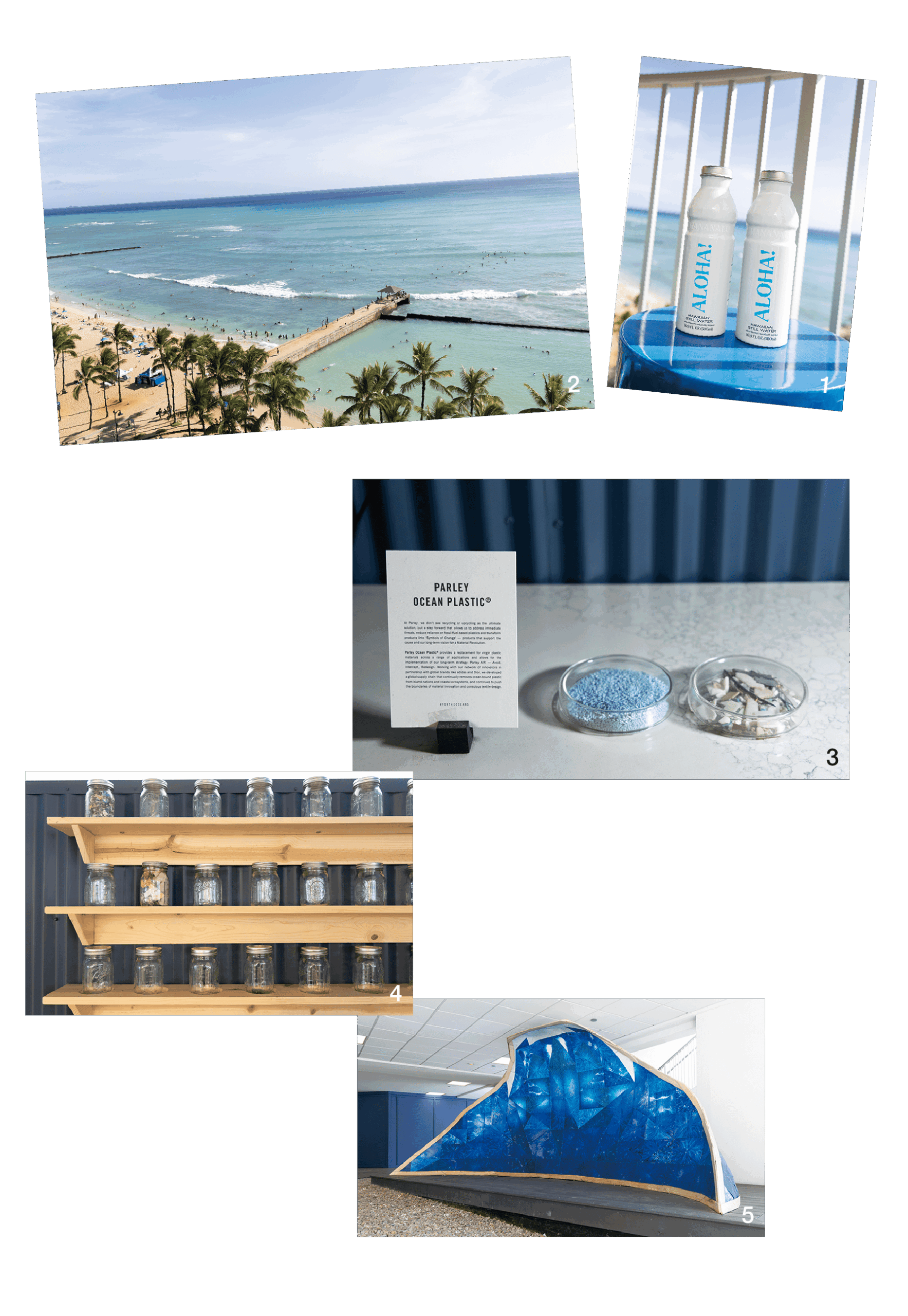 1.客室に置かれたウォーターボトルはチェックアウト後に返却し、熱消毒後に再利用される。ホテル内の各所にはウォーターサーバーも設置されている。2.光に満ちたワイキキの絶景を、特等席で見渡せる。3.海の保護活動をする団体「Parley」とのコラボレーションによる展示コーナー。プラスチックゴミが、生物に悪影響を与える悪循環を説明する。4.ゲストを交え定期的に海岸のマイクロプラスチックを回収するビーチクリーンで使われる瓶。5.ビーチクリーンで回収したプラスチックゴミを使い制作された波のアートが、エントランスを飾る。6.パラソルやサーフボード、ビーチバッグなど、レンタルショップにはあらゆるビーチグッズが。宿泊ごとにもらえるポイントで、ビーチグッズに交換することが可能。7.館内には、自然を感じるアートが点在する。8.海を感じさせてくれるナチュラルなインテリア。