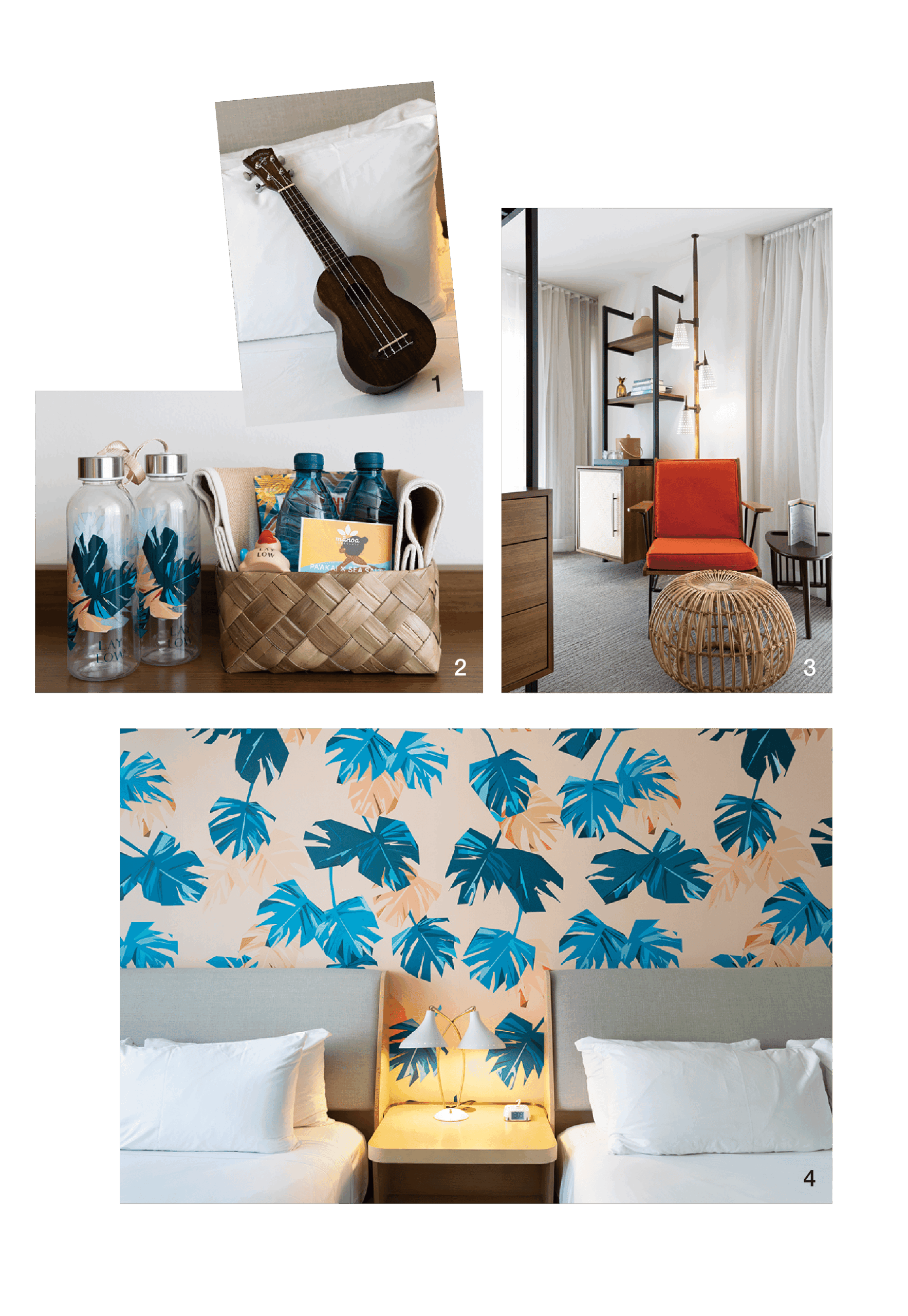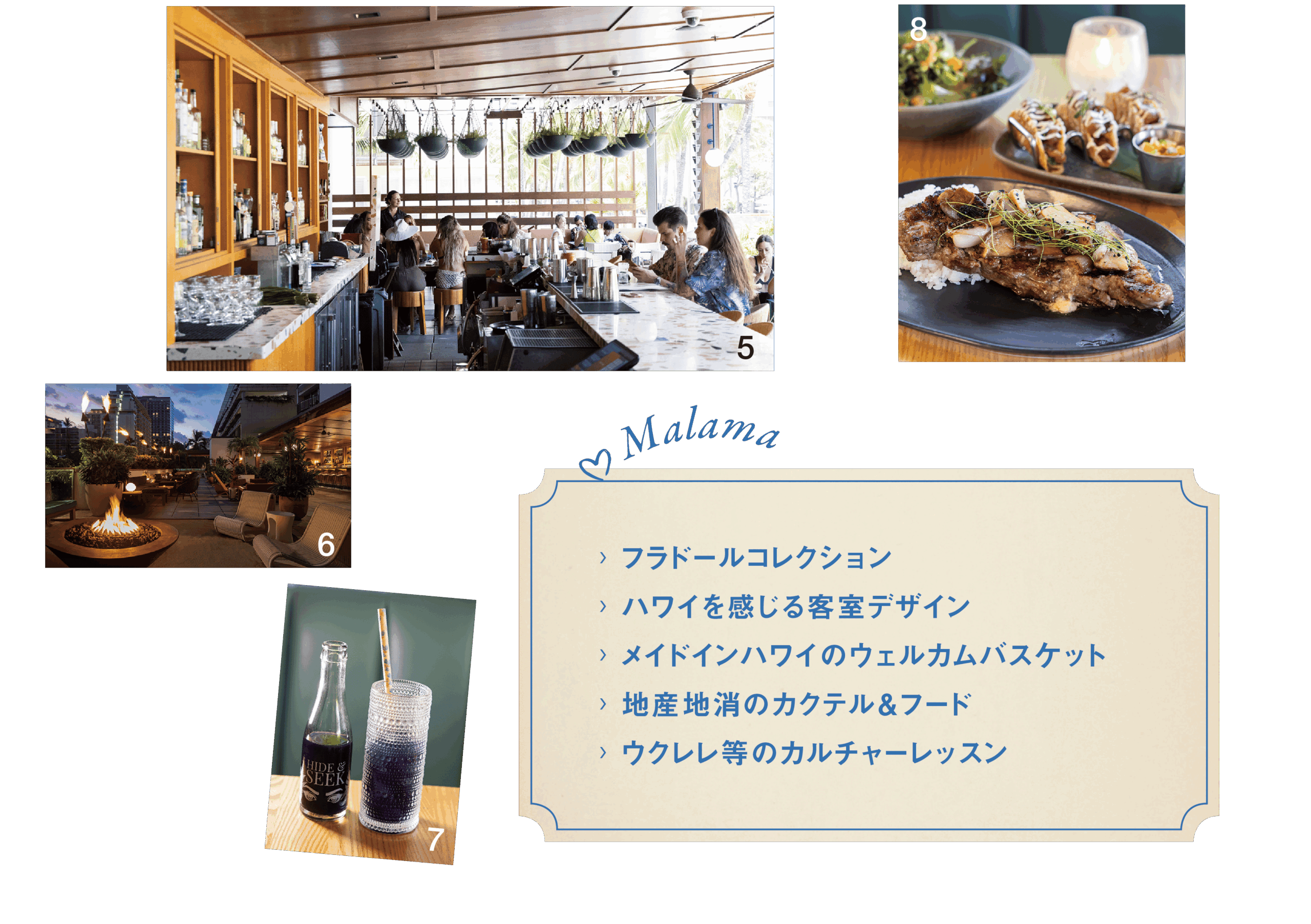 1.客室に置かれたウクレレを持って、ホテルのウクレレレッスンに参加しよう。2.客室に用意されたウェルカムバスケットには、リユースできるウォーターボトルも。3.スイートルームの客室の一角に、ゆったりと過ごせるコーナーが。4.客室の壁紙はモンステラをモチーフにしたオリジナルのデザイン。5.オープンエアで心地いいレストラン「Hideout」。6.レストランのテラス席にはファイヤーピットがあり、夜も美しい。7.バーでは、鮮やかな紫色が特徴のウベを使った特製カクテルHideandSeek$23を。8.肉厚のステーキにはハワイ産マッシュルームがたっぷり。GrilledNewNYSteak$49、ハワイ近海で採れたマグロのポケをタコスに包んだWontonPokéTacos$22、地産の野菜をたっぷり使ったサラダIslandGreen$17