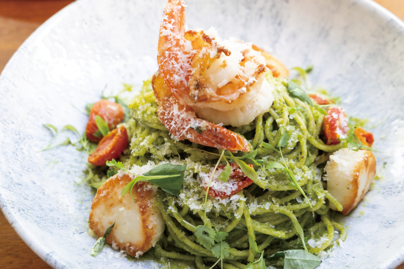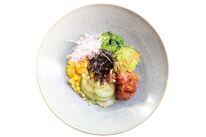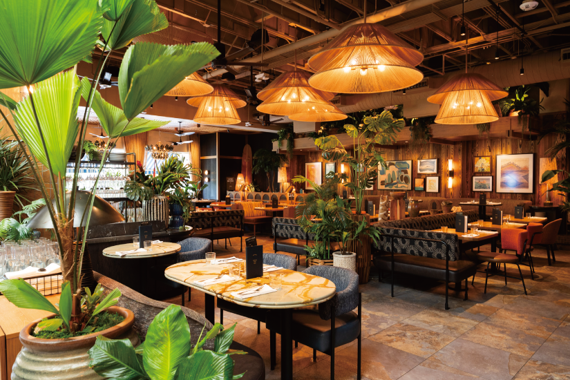 昨年10月ワイキキの中心地にオープン。広々としたダイニングエリアは、ハワイらしい南国の植物に囲まれた居心地のよい空間が広がる。ランチタイムはもちろん、遅くまで営業しているのでローカルの最新ナイトスポットとしても人気。