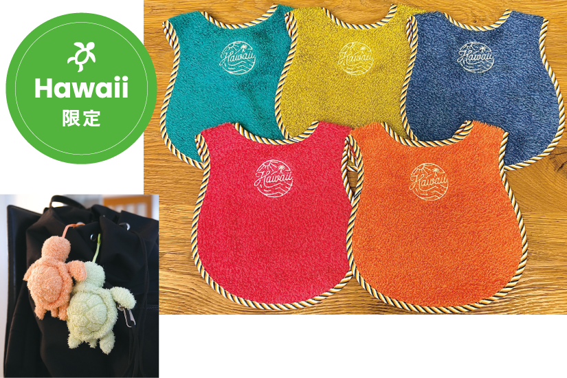 高品質タオルブランド「ヒポポタマス」のハワイ限定品。オーガニックコットンとエコ素材の再生竹繊維使用で、赤ちゃんが口に含んでも安心。ホヌのチャーム$27。5色展開のスタイ$38(縦35.5㎝x横22.5㎝