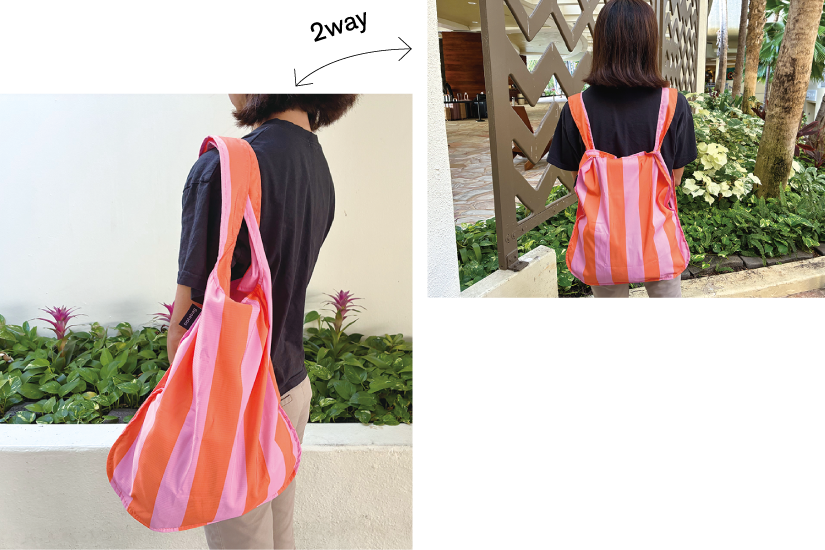 持ち方次第でトートバッグ&バックパックとして楽しめる、新感覚の「ノットアバッグ」。水をはじき洗濯機でも洗えて、売上の1%が地球保全の非営利団体に寄付されるエコロジーバッグ。$28(縦65㎝x横45㎝ )。