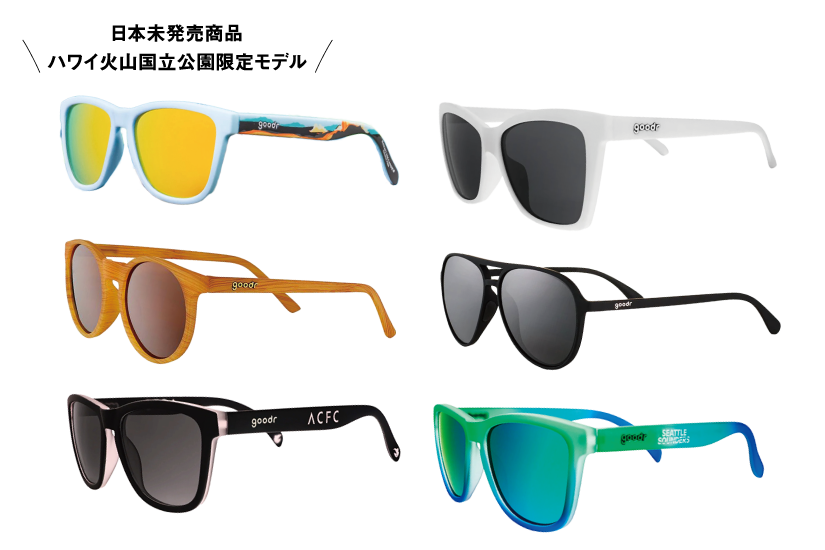 新型、新デザイン続々入荷!軽くて汗に強い、日常使いに最適なカラフルサングラス。上段左から:Hawaii Volcano 日本未発売商品 $30、Pop-G $25、中段左から:CG $25、Mach-G $25、下段:メジャーリーグサッカーとのコラボ商品。左AngelCityFC、右SeattleSoundersFC。OG各$35
