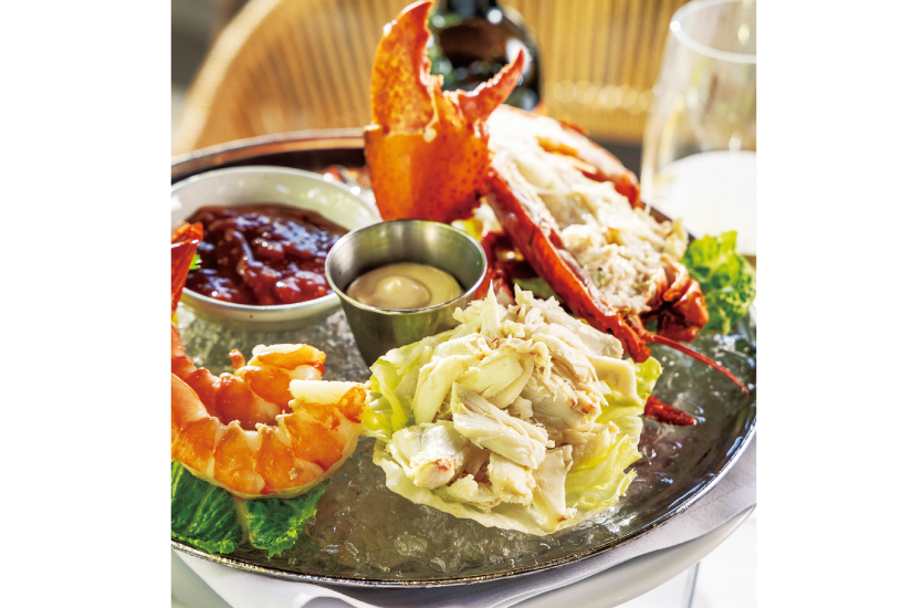 前菜:シーフードタワー(ジャンボシュリンプ、ジャンボクラブミート(カニ)、ロブスター)
